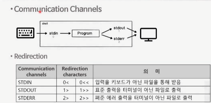 Bash shell에서는 번호를 붙여서 이를 관리한다. 입력은 0번, 출력은 1번, 에러 메세지 출력은 2번으로 관리한다.