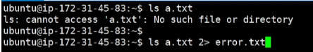 먼저 우리는 에러가 뜨는 말도 안되는 명령어를 입력한다. 그 후 2> error.txt를 통해 결과창을 Terminal로 오게 하는게 아닌 파일 형태로 유지하게 만들 수 있다.