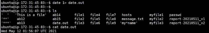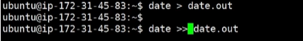 우리는 date 뒤에 1 즉 정상적인 결과를 > date.out이라는 파일을 만들어서 결과를 터미널이 아닌 파일에 저장하게 했다.