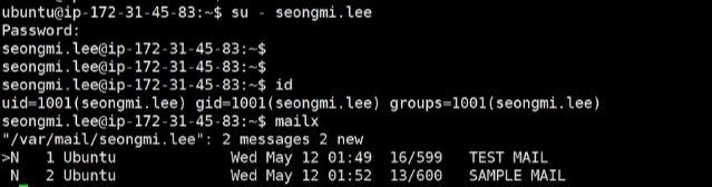 이제 결과를 확인 해 보자 먼저 다른 계정으로 스위치 유저를 진행한 후 mailx를 입력한 결과 두가지의 메일을 확인할 수 있었다.