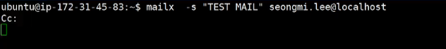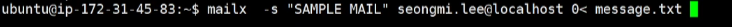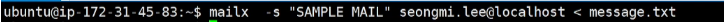 우리는 mailx 라는 명령어를 사용할 것이고 seongmi.lee@localhost 로컬 호스트로 TEST MAIL이라는 제목을 가진 메일을 보낼 것이다.