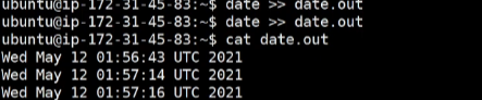 그 후 ls를 쳐보니 date.out이라는 파일이 생성된 것을 알 수 있었고 cat 명령어를 통해 살펴본 결과 시간이 잘 출력되는 것을 확인할 수 있었다.