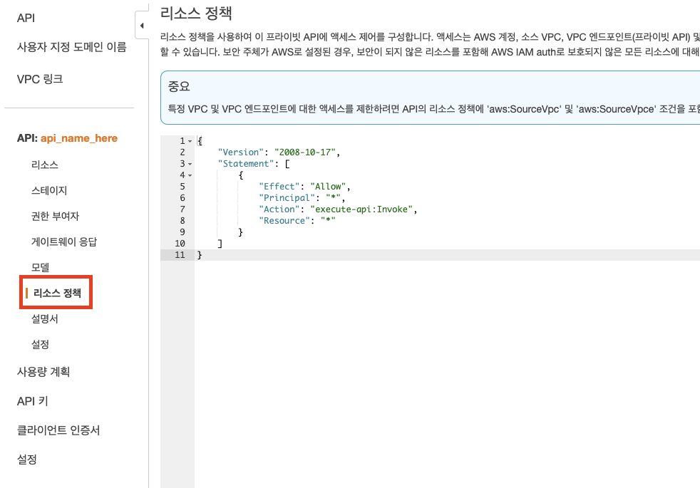 - 선택한 API → 리소스 정책 → 리소스 정책 추가