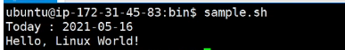 그 다음 sample.sh를 통해 명령어를 실행시켰다. 환경변수에 bin을 넣었기 때문에 date나 echo 같은 리눅스 명령어처럼 ./을 사용하지 않고 바로 실행시킬 수 있었다.