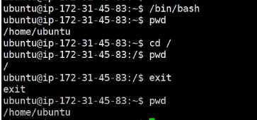 먼저 bash 셸을 서브셸로 시작을 한 후 위치를 최상단 디렉토리로 변경한다. 그 후 exit를 누르고 마지막으로 현재 위치를 살펴보면 어디일까? 바로 /home/ubuntu이다.