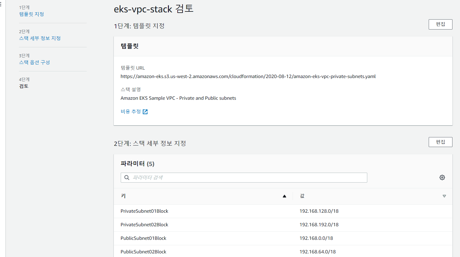 - eks-vpc-stack 최종 검토 -> 스택 생성 클릭