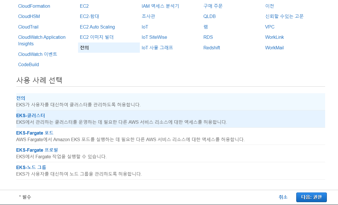 - IAM -> Role -> EKS -> EKS Cluster 선택