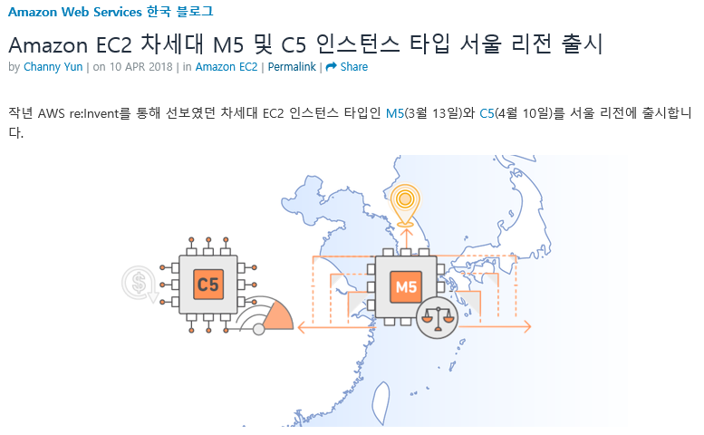 지난해 2018년 3월 이후 Amazon EC2 5세대 인스턴스가 서울리전에 출시되었습니다.