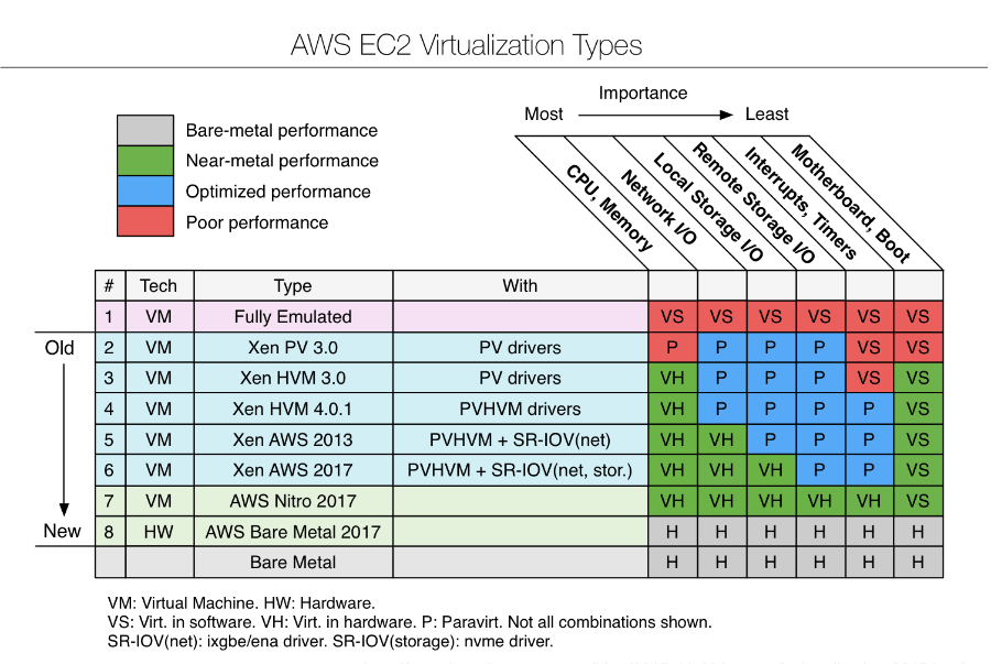 EC2 instance의 가상화 기술은 아래 표와 같이 Xen PV 으로 시작하여 Xen HVM 을거쳐 Nitro 까지 발전을 거듭해왔습니다.