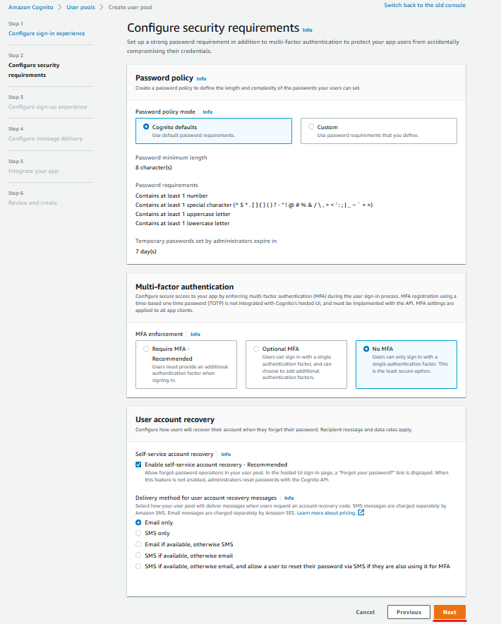 두 번째 단계에서는 패스워드 정책과 MFA, 계정 복구에 대해 지정해 줄 수 있습니다.