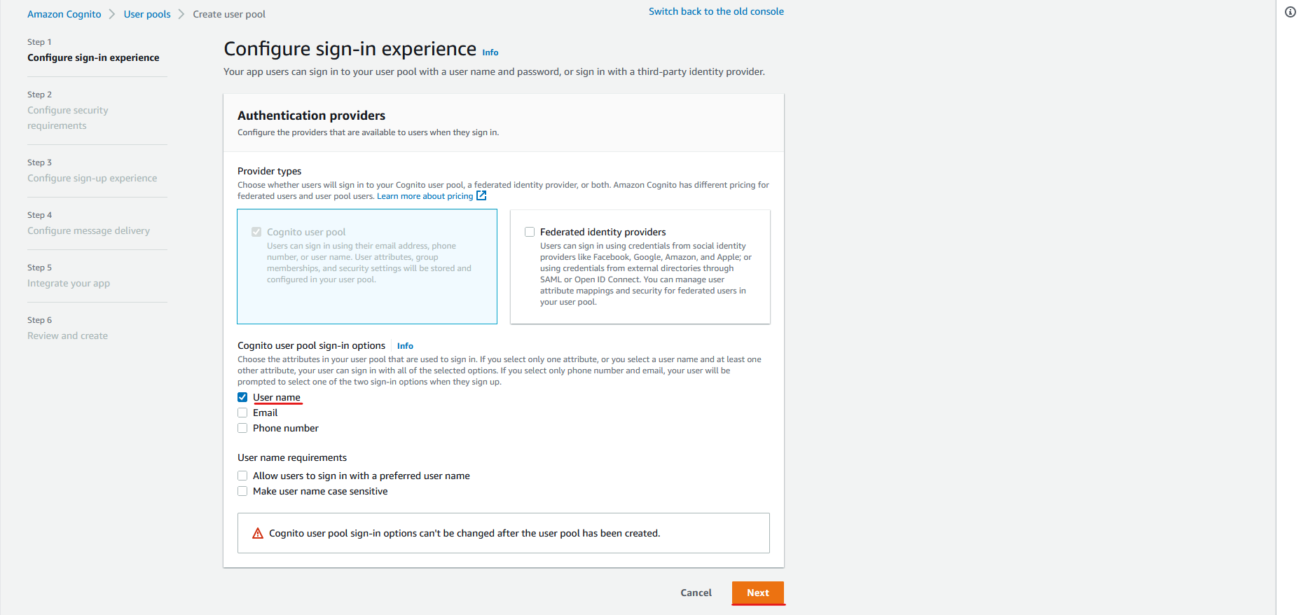 이번 포스팅에서는 Cognito user pool 옵션만 선택하고 로그인 옵션은 중복 선택이 가능하지만 사용자 편의를 위해 User name만 선택해 줍니다.