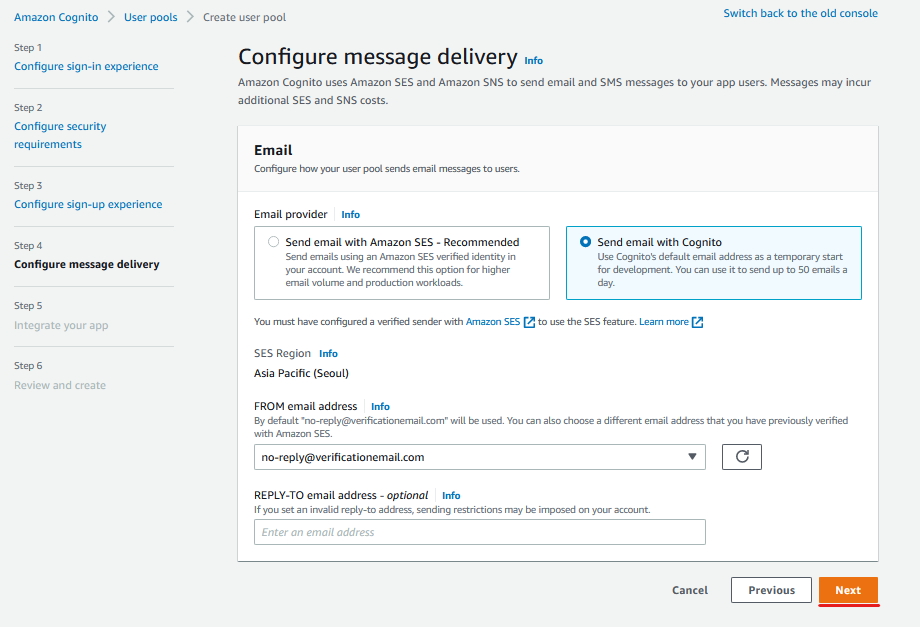 네 번째 단계에서는 사용자에게 확인 코드등을 보낼 때 어떤 이메일로 보낼지 지정해 줄 수 있습니다.