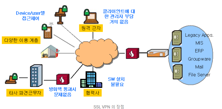 SSL VPN은 VPN 게이트웨이 (서버) 장비 1개와 VPN 클라이언트를 통해 웹브라우저를 통해 연결하는 VPN이다. VPN 장비 하나만 있으면 되기 때문에 비용이 적게든다.