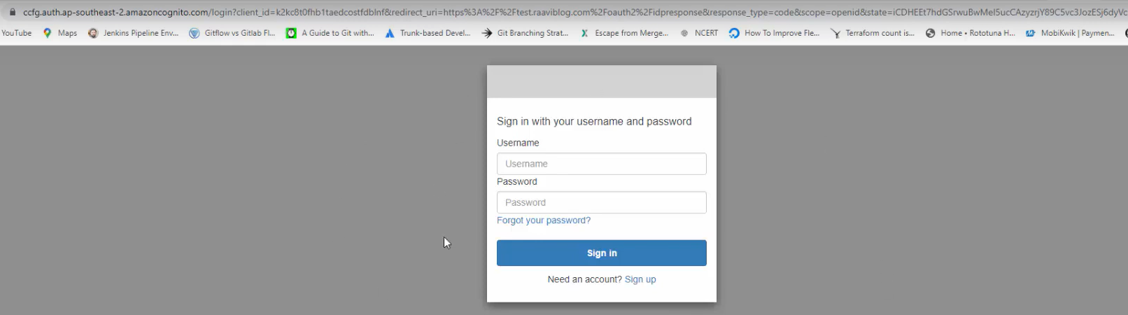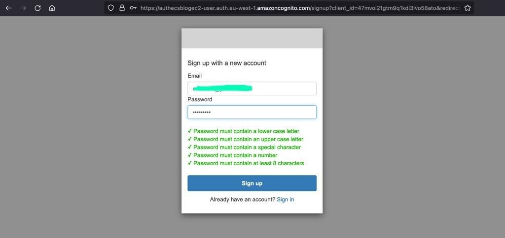 ALB가 Amazon Cognito 구성 도메인의 로그인 페이지(Amazon Cognito에서 호스팅하는 UI)로 리디렉션한 후 자격 증명을 입력합니다.