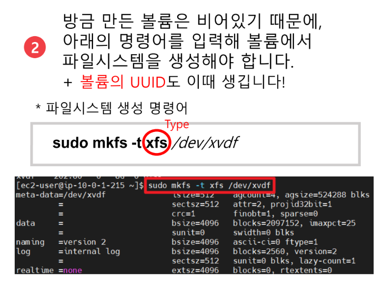 * sudo mkfs -t {볼륨 Type} {볼륨 장치명} : 해당 볼륨을 파일시스템으로 포맷하는 명령어
