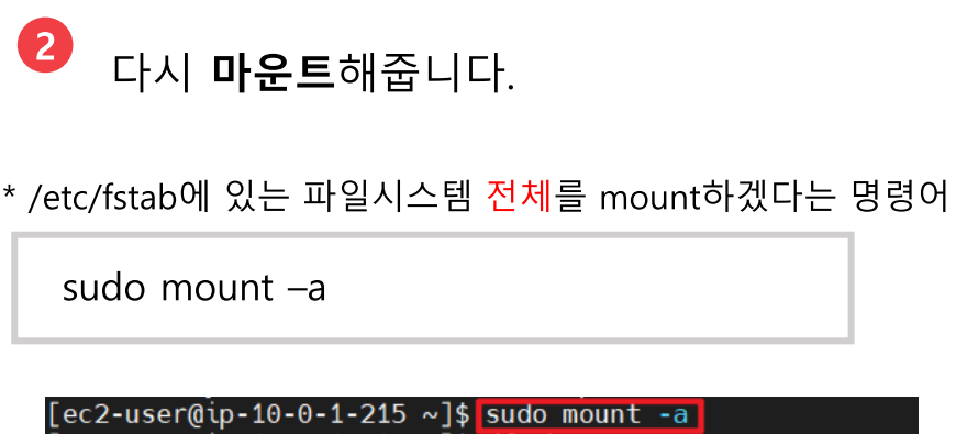 * sudo mount -a : /etc/fstab에 있는 파일시스템 전체를 다시 mount하겠다는 명령어(뒤덮어쓰는 개념, 굳이 umount 안해도 덮어씌워지기 때문에 해당 명령어만 이용하면 됩니다!)
