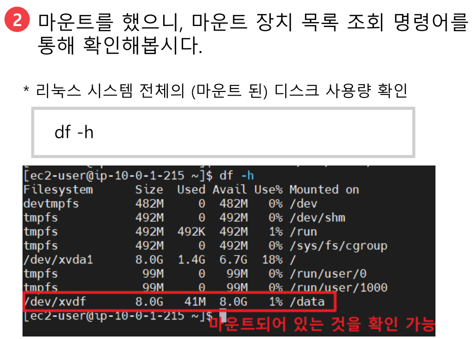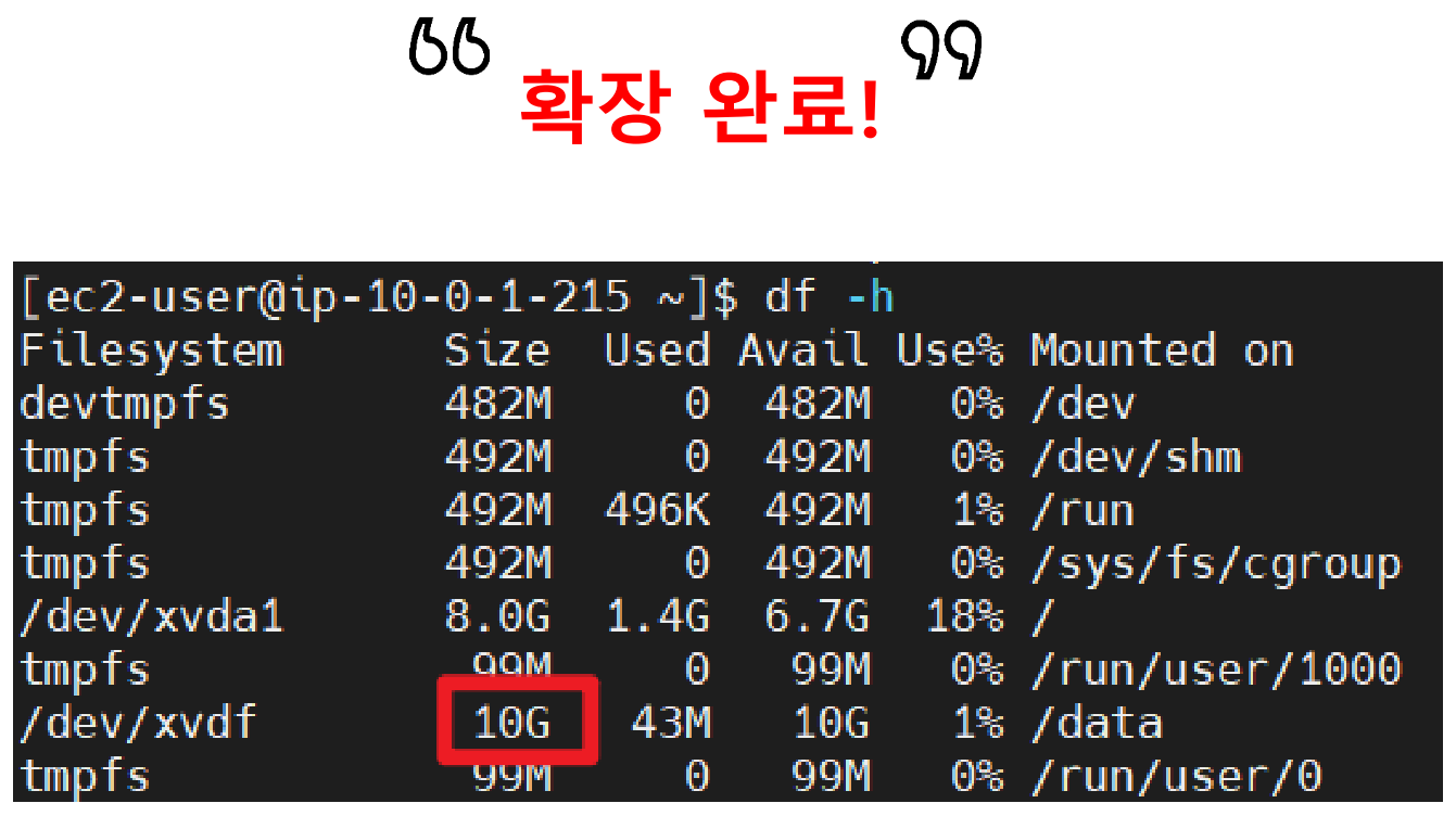 * sudo resize2fs {장치명} : ex4 볼륨 유형일 때 - /dev/xvdf 장치명을 가진 볼륨을 확장하겠다는 명령어
