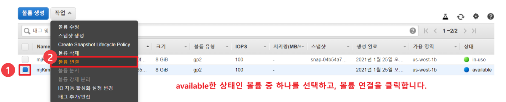 그렇기 때문에, 방금 만든 EBS 볼륨을 체크하고 작업 메뉴에서 볼륨 연결을 클릭해주세요.