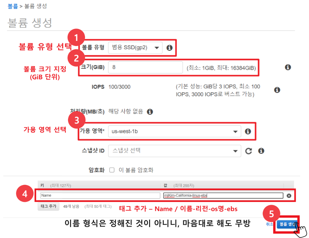 아래 사진의 순서대로 선택하고 입력한 후에, 볼륨 생성 버튼을 눌러주세요.
