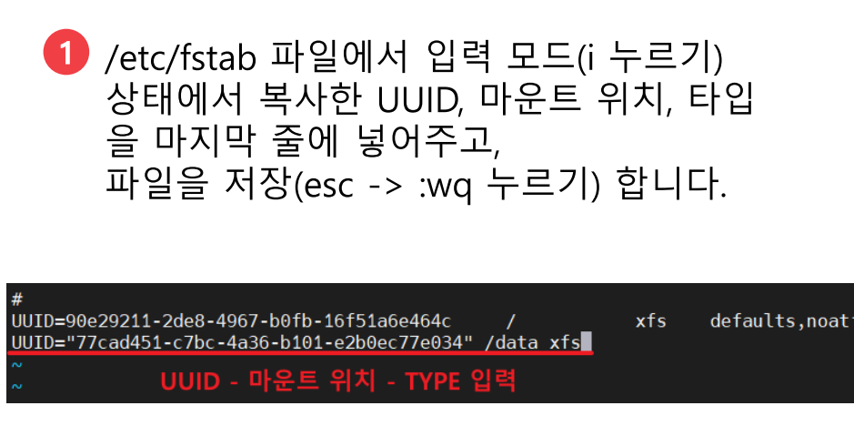 * sudo vi /etc/fstab : 리눅스에서 사용하는 파일시스템 정보를 정적으로 저장하고 있는 파일인 /etc/fstab을 열어줍니다.