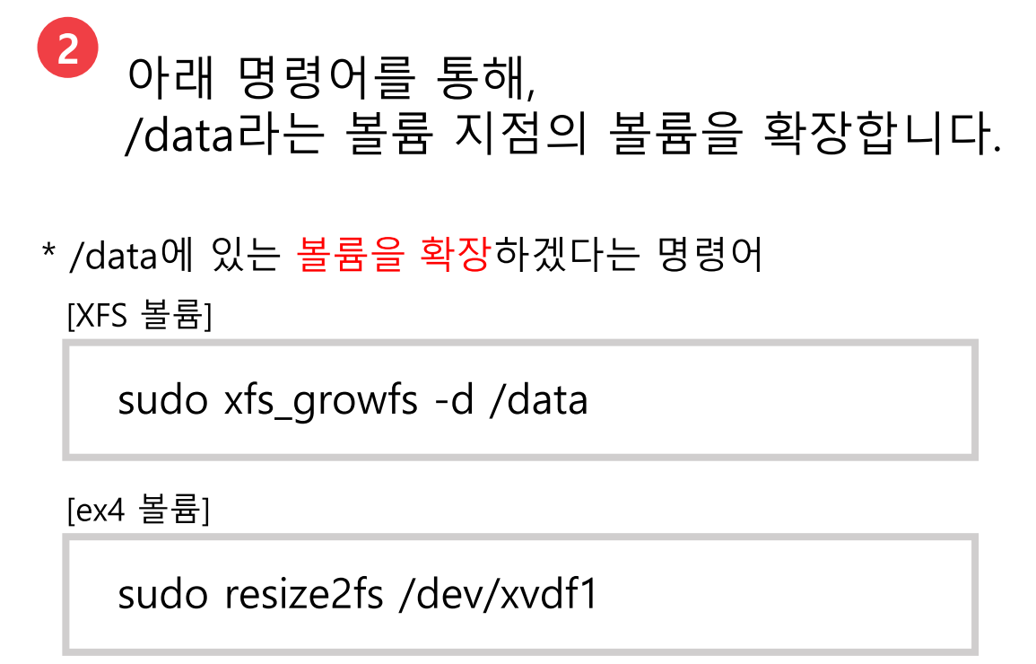 * sudo xfs_growfs -d {마운트 위치} : XFS 볼륨 유형일 때 - /data 폴더 안의 볼륨을 확장하겠다는 명령어