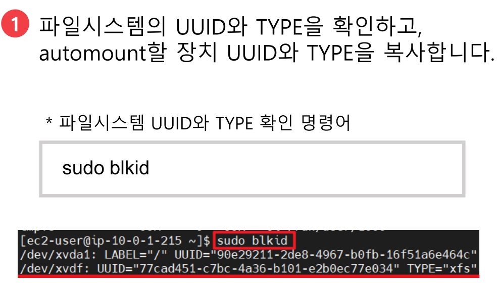 * sudo blkid : 현재 파일시스템들의 UUID와 TYPE을 확인할 수 있는 명령어