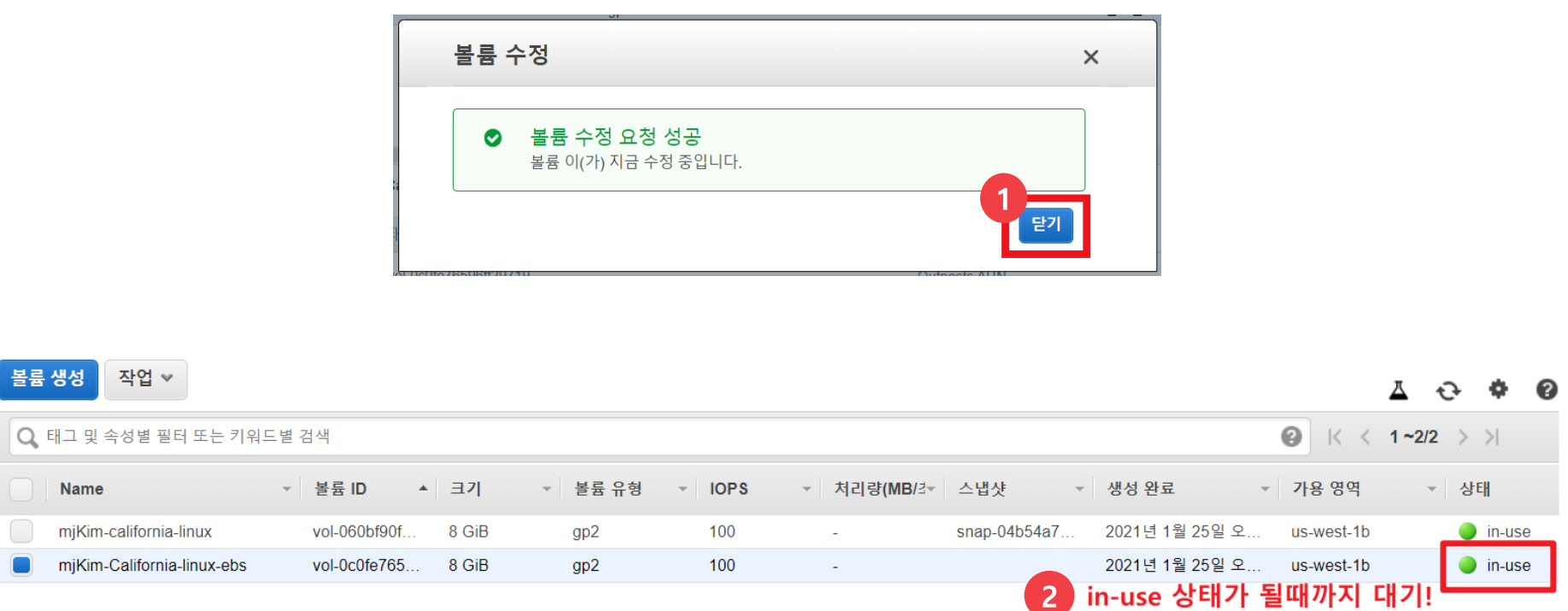볼륨 수정이 완료되고, 닫기를 누른 후 볼륨 목록에서 in-use 상태가 될때까지 기다려주세요.