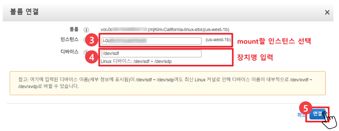 어떤 EC2 인스턴스에 마운트할 것인지, 여기서 선택해줍니다.