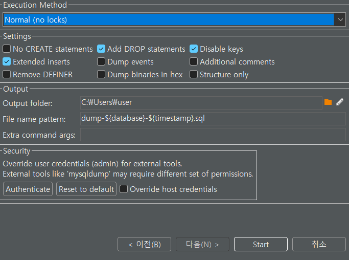 우클릭한 후 도구 -> Dump database를 눌러서 진행해 준다.