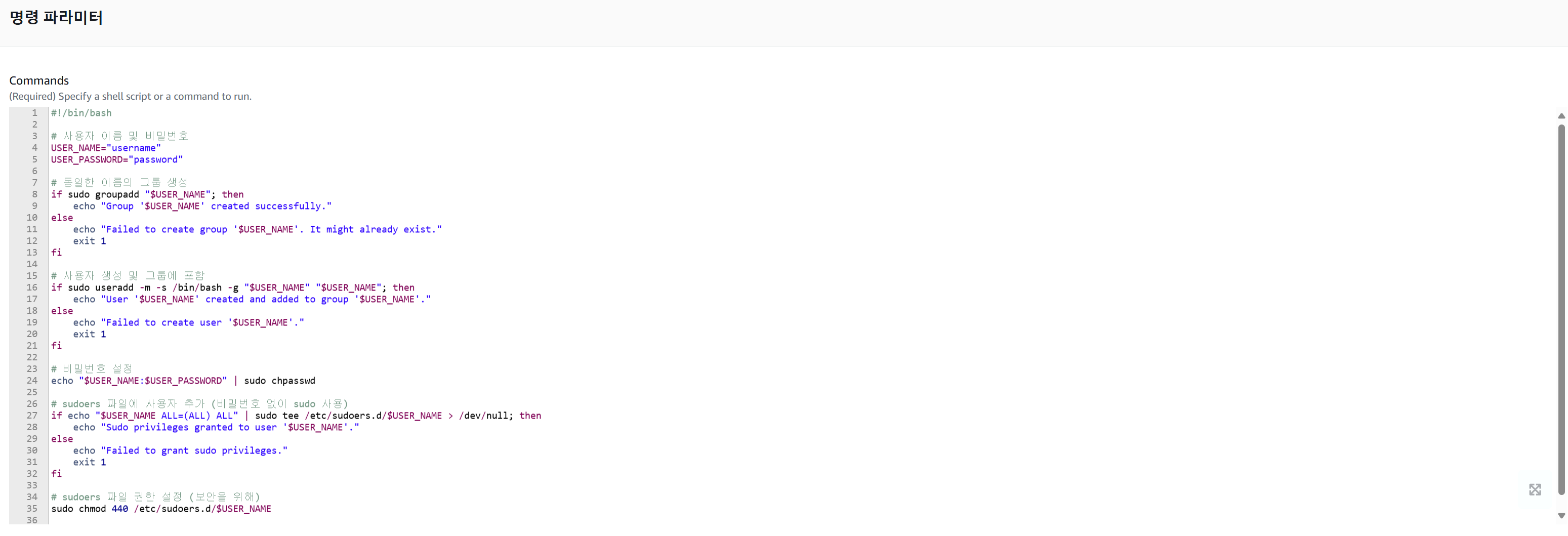 명령 파라미터에 밑에 위치한 스크립트 파일을 복사해 준 후 자신이 원하는 사용자 이름 및 비밀번호를 입력한다.