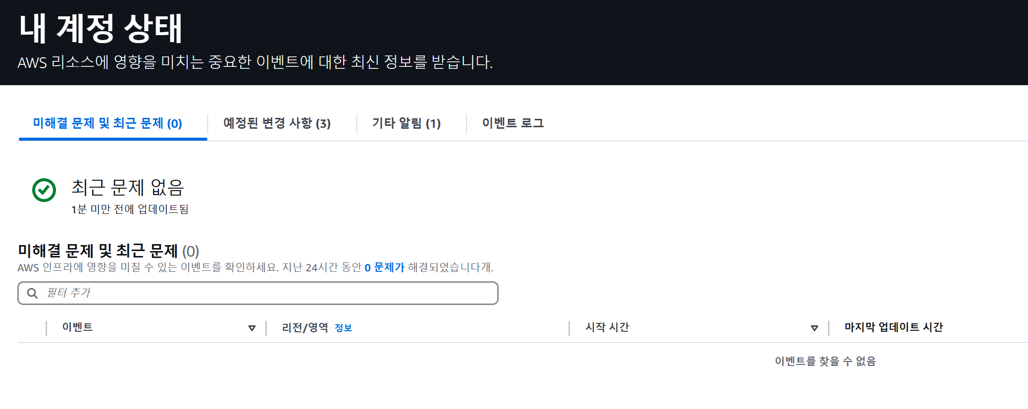 해당 페이지는 Personal Health Dashboard로 고객 환경에 영향을 줄 수 있는 AWS 이벤트에 대한 알림과 지침을 제공합니다.