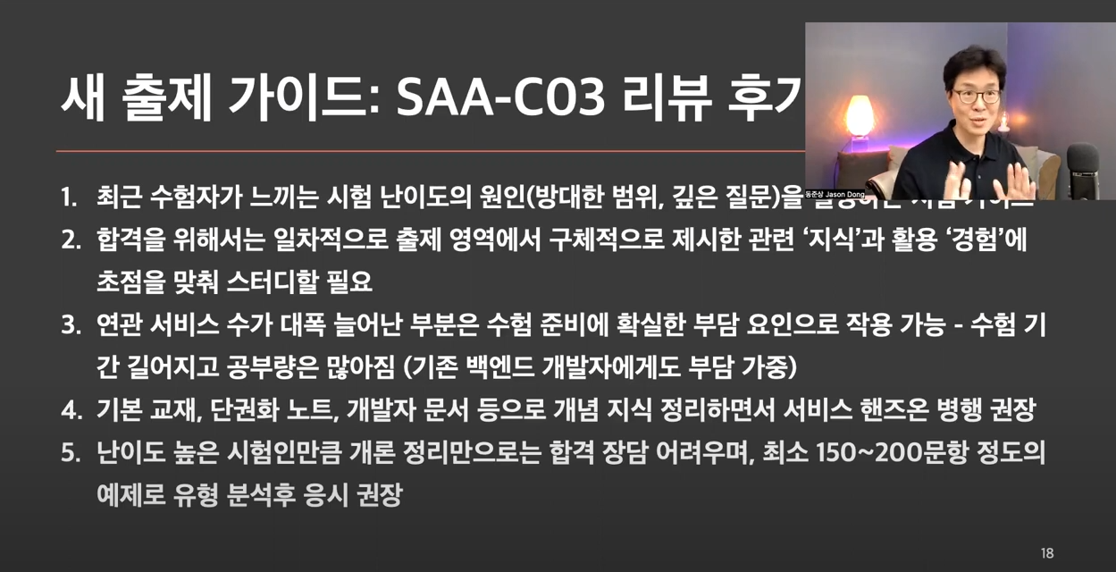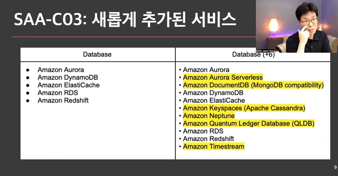 DataBase의 경우는 항목상으로 추가되었는데, Aurora와 Aurora의 Serverless의 지향하는바가 다르다보니, Aurora를 줄이고 Aurora Serverless를 많이 낼 가능성이 있다. DynamoDB에 대한 출제 비중이 높은데, 기존의 요소들도 신경을 써야하며, 새롭게 추가된 요소가 어떤 관점에서 강조를 하는지 알아야 한다.