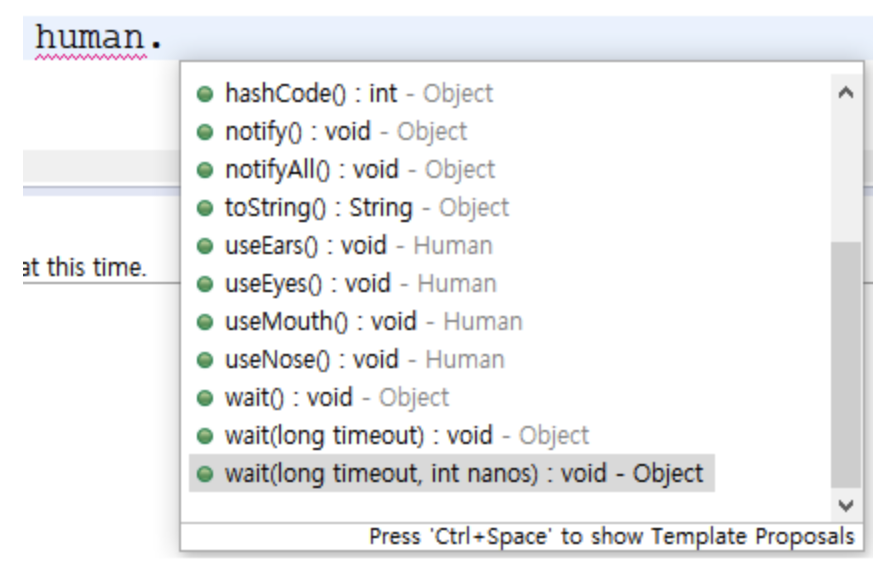우리는 단지 위 4개의 메소드만을 정의했다. 하지만 우리가 정의하지 않은 메소드들도 리스트에 나온다. 우리는 분명히 아래와 같은 hashCode, notify, wait과 같은 메소드들은 정의하지 않았다. 해당 내용이 무엇인지 알기 위해서는 우선 Object 클래스를 알아야한다.