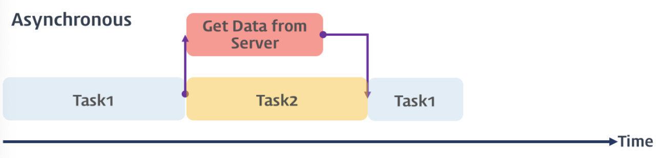 예를 들어 서버에서 데이터를 가져와서 화면에 표시하는 테스크를 수행할때, 서버에 데이터를 요청한 이후 서버로부터 데이터가 응답될 때까지 대기하지 않고(Non-Blocking) 즉시 다음 테스크를 수행한다.