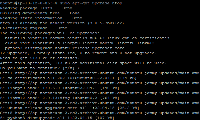 sudo apt-get install htop이라고 입력한 후 엔터를 누른다. 그러면 htop이 다운로드가 되게 된다.