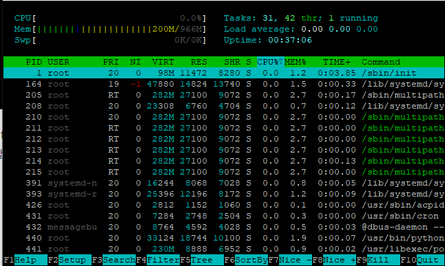 그 후 htop이라고 한 후 엔터를 누르면 아까 top과는 다르게 많이 화려한 모습을 볼 수 있다.
