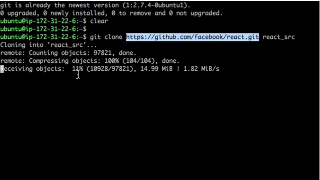 git을 다운로드 한 후 오픈소스 프로젝트의 파일이나 변경사항들을 복제하는 명령어인 git clone 명령어를 사용한 후 뒤에 위에서 복사한 HTTPS 주소를 입력하고 한 번 띄어쓴 후 디렉토리 이름을 작성하면 react_src라는 디렉터리에 react를 다운받게 된다.