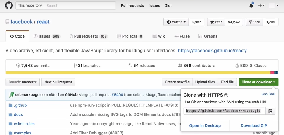 가장 대표적인 git의 웹 호스팅 서비스인 github의 화면이다. 이렇게 URL을 통해서 Clone을 진행할 수 있고 git 명령어를 통해서 Clone을 진행 한 소스 파일들을 다운로드 할 수 있다.
