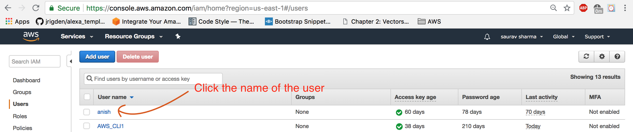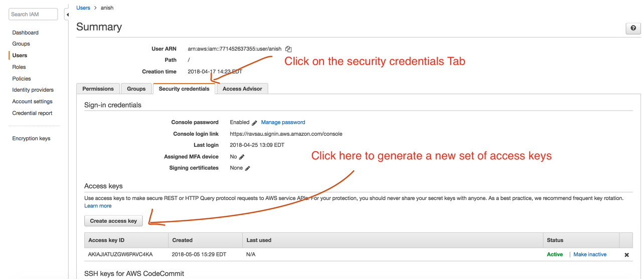 Then Click on the user's name and navigate to the security credentials tab. Click create access keys