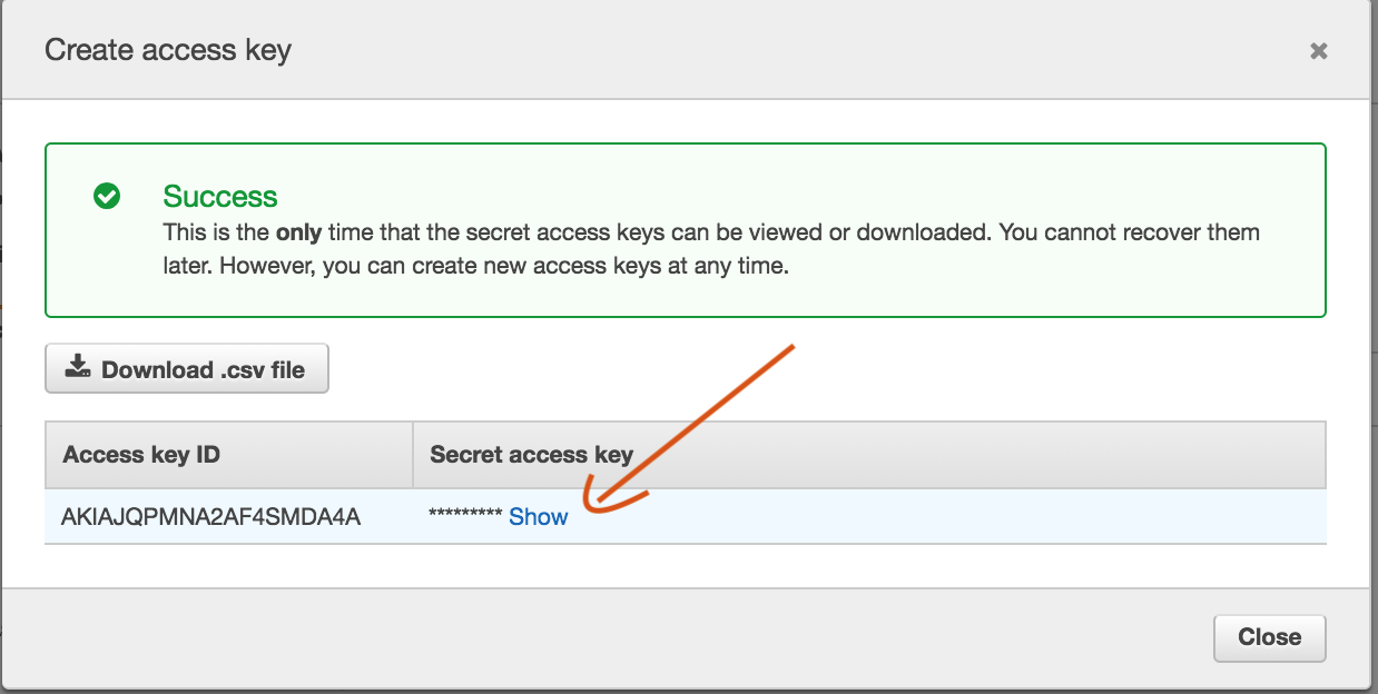 Either download the csv file or, click show keys. Now you have both the access_key and secret_key required for the terraform code above.